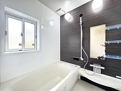 お風呂には大きな窓もございますので換気も安心です。また、木目調の壁を採用することで明るい、かつ、落ち着く空間を実現しております。