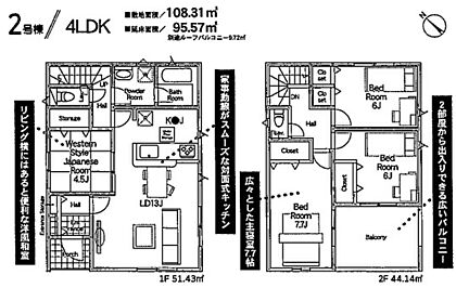 | 建物面積 | 95.57m2 | 土地面積 | 108.31m2(実測) |