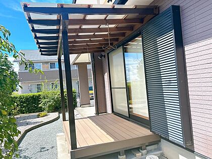 【現況/ウッドデッキ】お庭側にはウッドデッキがあります。休みの日にウッドデッキでゆっくりするのもいいですね。また雨降り時の洗濯物を干すスペースにもなります。