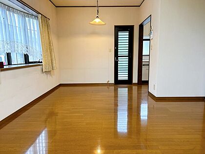 【現況】リビングには出窓がありますので、開放的なリビングになっています。駐車場側に勝手口もあるので、駐車場から直接荷物の搬入もできますね。