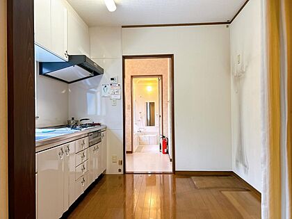 【現況販売/キッチン】キッチンスペースです。約16帖のLDKでキッチンスペースも十分に確保されています。窓があるので明るいです。リビングと仕切って使うこともできますね。