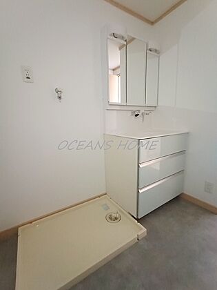 三面鏡・シャワー付き洗面化粧台◎朝の身支度が捗りますね♪鏡裏も収納となっており、収納性豊富!