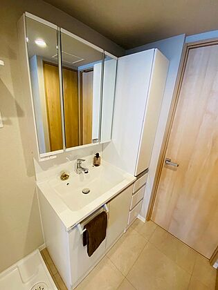 【散らかりがちな洗面周りもすっきり!】豊富な収納スペース付き洗面台で、毎日使うものが綺麗に収まり、快適な朝の身支度を。何かと物が増える場所だからこそ、スッキリと見映えの良い空間に。