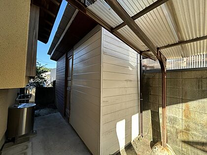 【リフォーム前 外観】駐車場後ろのスペースの写真です。物置が置いてありますが、こちらは撤去予定です。