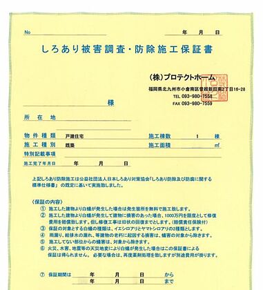 シロアリ防除には5年間の保証付き(施工日から。施工箇所のみ施工会社による保証)