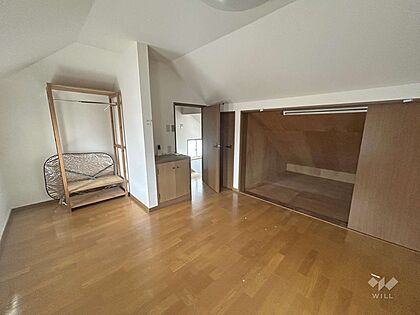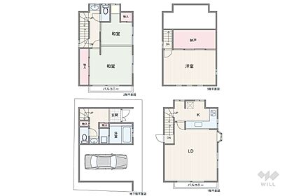 水回りが1階に集結しているため、家事動線がスムーズです。キッチンはL字型のカウンターキッチンで、洋室、和室が揃っています。納戸もあるため収納力高めです。