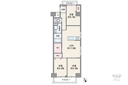 間取りは専有面積62.63平米の3LDK。LDK約11.5帖のセンターリビングのプラン。複数方向に採光部があり、バルコニー面積は5.87平米です。