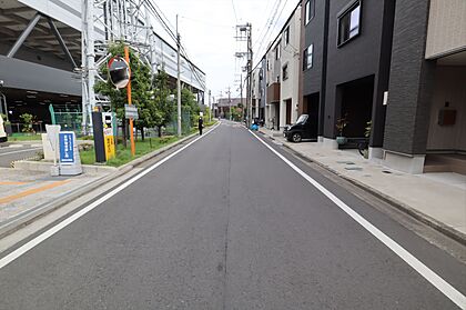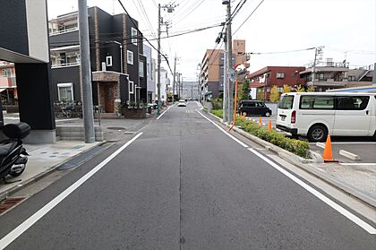 物件の北側前面道路(西側から)車通りは少ないので安心してお過ごしいただけます。