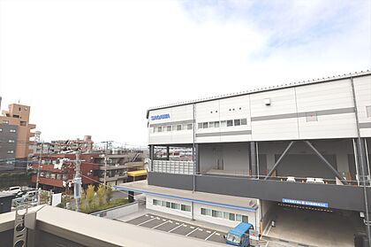 バルコニーからの眺め。前面に建物がないため日当たり・通風良好です。人通りや車通りも少なく、外からの目線も気になりません。