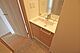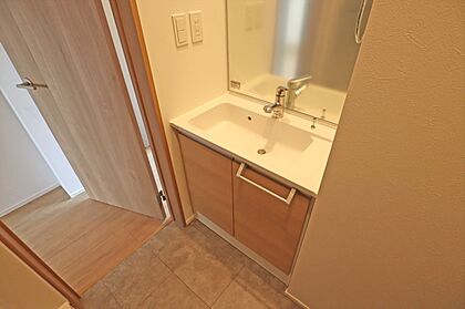洗面室。コンセントがあり、身支度に便利です。洗面台の下にも収納スペースがあります。