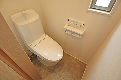 トイレ。温水洗浄便座つきなので清潔を保てます。手洗い場つきで、すっきりとした見た目になっています。