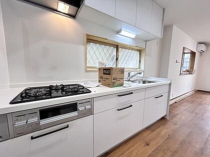 【リフォーム中/キッチン】9/29撮影。ハウステック製の新品に交換しました。天板は熱や傷にも強い人工大理石仕様なので、毎日のお手入れが簡単です。