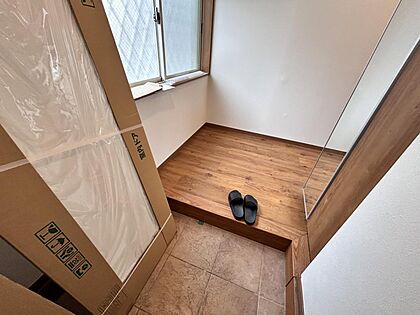 【現在リフォーム中/玄関(内側)】9/8撮影。玄関内はシューズボックス、照明器具の交換、クロス張替え等を行います。