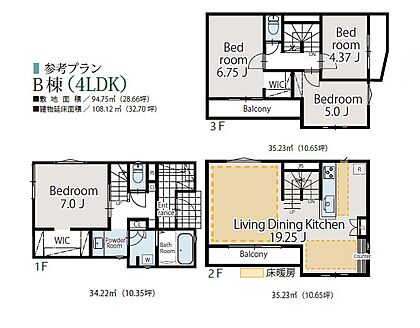 【B区画参考プラン】建物参考価格2,300万円、4LDK、延床面積108.12m2。玄関のすぐ近くに洗面室を配置。帰宅後すぐに手洗いやうがいができるため、衛生面も安心です。