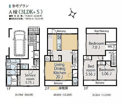 【A区画参考プラン】建物参考価格2,300万円、3LDK+1S、延床面積109.55m2。家族が自然と集まる広々としたLDK。ゆとりある空間設計で、家具の配置もしやすく開放感たっぷり。