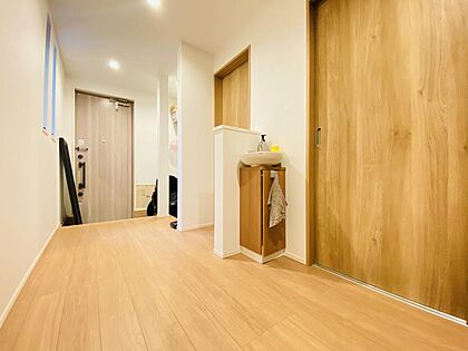 玄関側から見た1階ホール、木のぬくもりを感じられる温かみのある雰囲気が漂います。2階洗面所とは別に手洗い台もあるのが嬉しいポイントです。階段には手すりが標準設置されているので、上り下りも安心です。