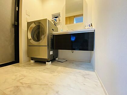 黒と白の洗練された雰囲気の洗面所。毎日使う場所だからいつも快適に、が大事です。お手入れしやすい洗面ボウルやホテルライクなデザインの洗面台など、美しさと機能性を兼ね備えています。