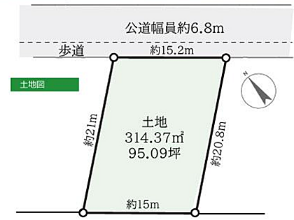 | 土地面積/坪(坪単価) | 314.37m2(登記簿)/95.26坪(10.50万円) | 代表的な接道 | 一方 公道 北東 6.8m ※詳細は備考欄をご確認ください |
