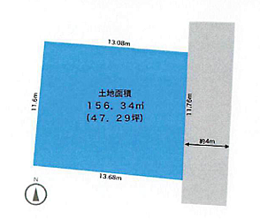 | 土地面積/坪(坪単価) | 156.34m2(登記簿)/47.38坪(35.50万円) | 代表的な接道 | 一方 私道 (位置指定) 東 4m ※詳細は備考欄をご確認ください |