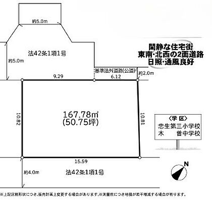 | 土地面積/坪(坪単価) | 167.78m2/50.84坪(81.20万円) | 接道 | − |