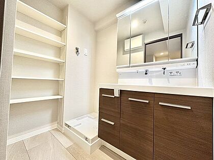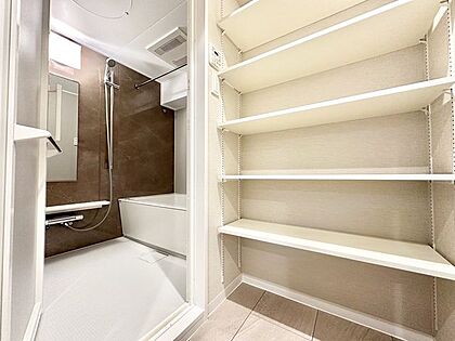浴室前には脱衣所スペースあり♪棚付きで衣類の収納もバッチリ♪