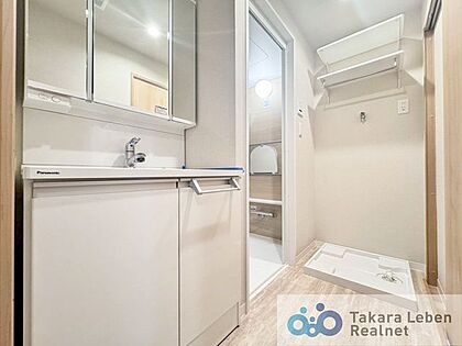 •  洗濯機置き場の上部には収納棚を設置。洗剤や掃除用具などもスッキリ収納できます。