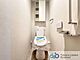 ウォシュレット機能付きのトイレ。壁面に収納棚が設置されているので、備品の収納もできますね!