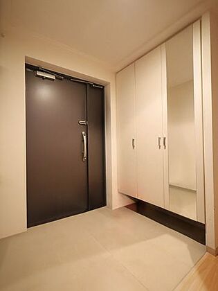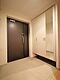 靴箱付きの玄関で、すっきりとした収納と美しい空間を両立。※現況の物件写真に、引渡し時のイメージとして CG による画像処理がされています。