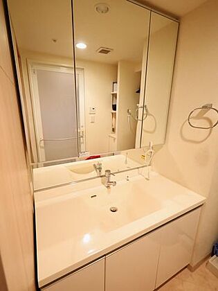 白を基調とした洗面台は、シンプルで使いやすいだけでなく、毎日の準備が楽しくなる快適な空間。スッキリとしたデザインが、気分まで爽やかにしてくれます♪