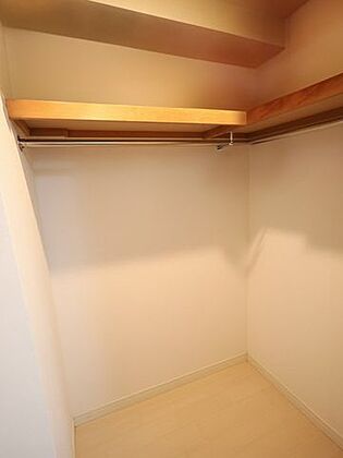 収納力たっぷりなウォークインクローゼットは、棚とハンガーパイプで楽々スッキリ収納♪※現況の物件写真に、引渡し時のイメージとして CG による画像処理がされています。