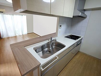 使いやすさ◎のシステムキッチン。毎日の料理がもっと楽しく、効率的に!※現況の物件写真に、引渡し時のイメージとして CG による画像処理がされています。
