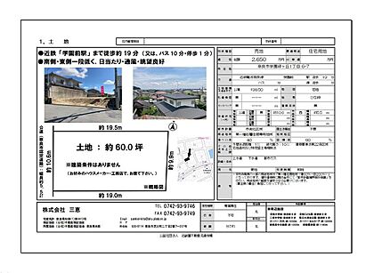 【接道】 一方 ( 公道 西 5.5m ) ●近鉄「学園前駅」まで徒歩約19分(又はバス10分・バス停歩1分) ●南側・東側一段低く日当たり・通風・眺望良好 ●建築条件はありません(建築はお好みのハウスメーカー・工務店でお建て下さい。) ●現況:更地 ●周辺施設:青和小学校まで徒歩約9分・青和こども園(幼稚園)まで徒歩約9分・二名中学校まで徒歩約9分・県立大渕池公園まで徒歩約4分・スーパー万代まで約1030m・スーパーならコープまで約1200m・西奈良中央病院まで約1300m・西部図書館まで約1180m ●用途地域は主に「第一種低層住居専用地域」ですが、南側の一部が「第一種住居地域」となっております。(建物建築時には関係省庁にて、用途地域の範囲を確定させる必要があります。) 外壁後退距離:1m 絶対高さ:10m 建築基準法第22条区域 宅地造成及び特定盛土等規制法  |