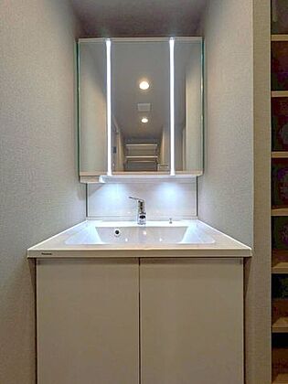 三面鏡付き洗面台は合わせ鏡ができるので、後ろの髪型までチェックできます♪