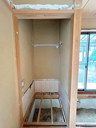 【リフォーム中10月19日撮影】LDKに新設予定のクローゼット収納のお写真です。小物類や衣服の収納に便利です。