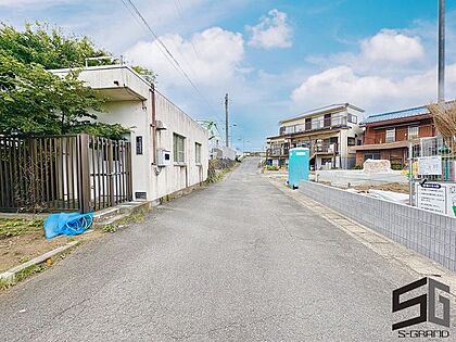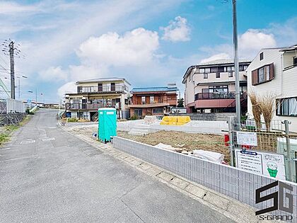 広々とした前面道路に面し、車の出し入れがしやすい現地外観。ゆとりある駐車スペースと開放感のある立地が魅力で、毎日の暮らしに快適さと安心をもたらすマイホームです。