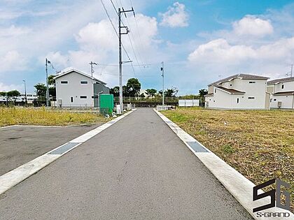 広々とした前面道路に面し、車の出し入れがしやすい現地外観。ゆとりある駐車スペースと開放感のある立地が魅力で、毎日の暮らしに快適さと安心をもたらすマイホームです。