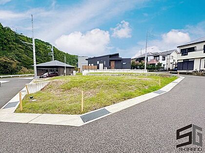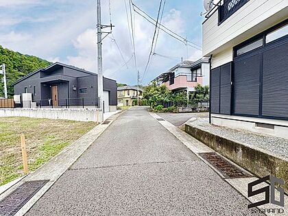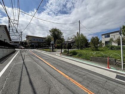 広々とした前面道路に面し、車の出し入れがしやすい現地外観。ゆとりある駐車スペースと開放感のある立地が魅力で、毎日の暮らしに快適さと安心をもたらすマイホームです。