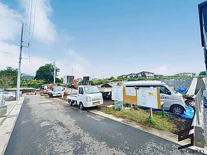 広々とした前面道路に面し、車の出し入れがしやすい現地外観。ゆとりある駐車スペースと開放感のある立地が魅力で、毎日の暮らしに快適さと安心をもたらすマイホームです。