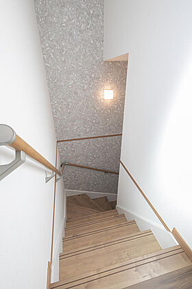 【階段】「ホワイト×木目」のコントラストが美しい内装です。手すり付きで、どなたでも安心して昇り降りができます。