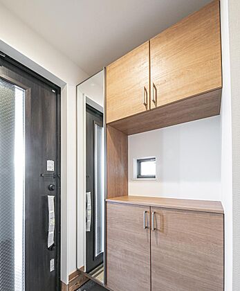 【玄関/施工例】玄関に収納力のあるシューズボックスを設置。靴や小物をすっきりと整理でき、いつも清潔で快適な玄関を保つことができます。
