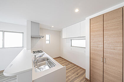【パントリー/施工例】パントリーや吊戸棚を配置すれば、食品や調理器具をすっきり収納でき、キッチン周りをいつも整った状態に保つことができます。
