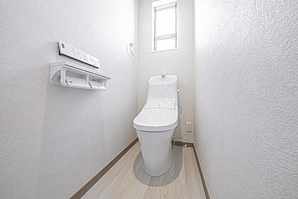 【トイレ/施工例】温水洗浄便座付き、手洗い器一体型のトイレ。シンプルで機能的なデザインに加えて、使いやすさを重視した設計です。