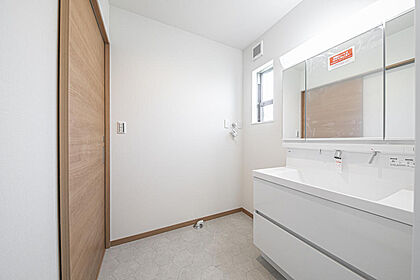 【洗面室/施工例】3面鏡付きの洗面台を設置した洗面室。洗面台の水栓は根本に汚れが溜まりにくい設計のため、お手入れが簡単で、清潔さをキープできます。