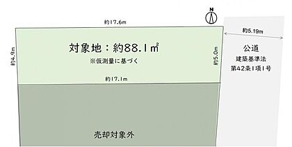 | 土地面積/坪(坪単価) | 88.17m2(実測)/26.72坪(291.90万円) | 代表的な接道 | 一方 公道 東 5.1m ※詳細は備考欄をご確認ください |