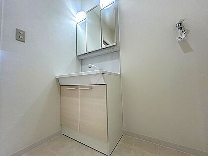 •  朝の準備がはかどる三面鏡の洗面台です!鏡の裏は収納スペースになっています◎