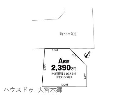 | 土地面積/坪(坪単価) | 110.87m2/33.6坪(71.10万円) | 代表的な接道 | 公道 北西 7.5m ※詳細は備考欄をご確認ください |