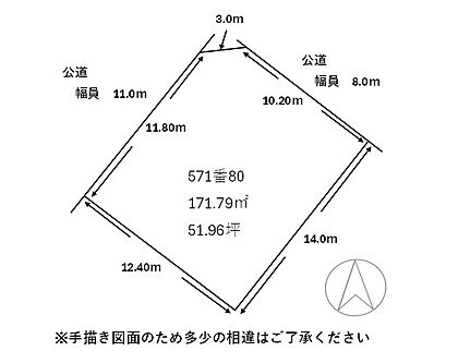 | 土地面積/坪(坪単価) | 171.79m2(登記簿)/52.06坪(29.40万円) | 代表的な接道 | 二方 公道 北東 8m、北西 11m ※詳細は備考欄をご確認ください |