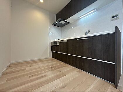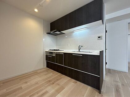 モダンなデザインのキッチンで、スタイリッシュな印象を与え、インテリアに調和します