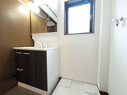 三面鏡の洗面台は、広い視野で身だしなみを整えやすく、収納力も豊富でスッキリとした空間を提供します!