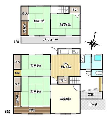 【お部屋の配置も自由自在!】1階には広々とした8帖の和室と洋室があり、2階には6帖の和室が2部屋あります。ライフスタイルに合わせて自由にレイアウトを楽しめますね!